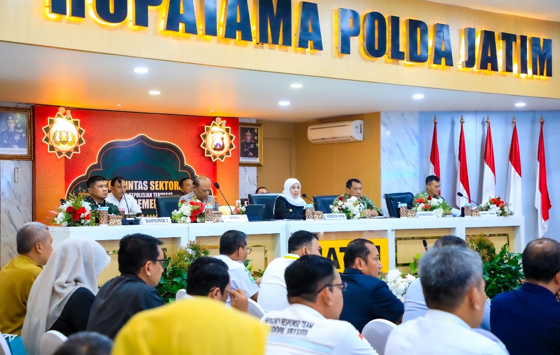 SURABAYA - Gubernur Jawa Timur Khofifah Indar Parawansa menghadiri Rapat Koordinasi (Rakor) Lintas Sektoral dalam rangka Operasi Ketupat Semeru 2026 di Rupatama Polda Jatim, Jl. A. Yani No. 116 Surabaya, Senin (9/3/2026).