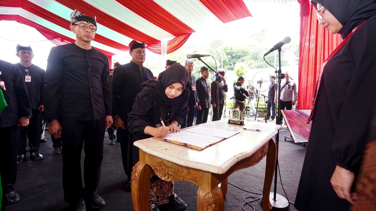 Bupati Banyuwangi Ipuk Fiestiandani melantik 58 pejabat Pimpinan Tinggi Pratama, Administrator dan Pengawas, di lingkungan Pemkab Banyuwangi, di Kantor Dinas Sosial PPKB Banyuwangi, Jumat sore (23 Januari 2026).