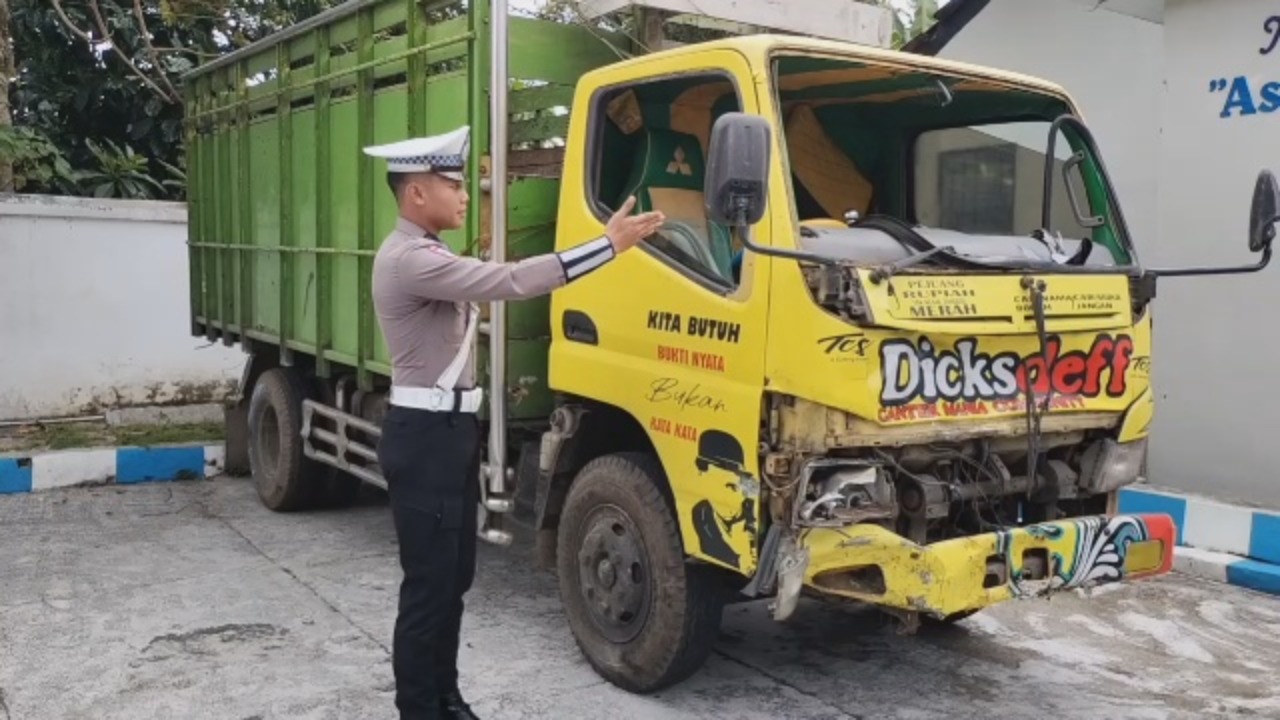 Terlihat kondisi motor tergencet ke pohon, yang sebelumnya terseret truk, satu korban ikut bersama motor dan korban lain terpental.