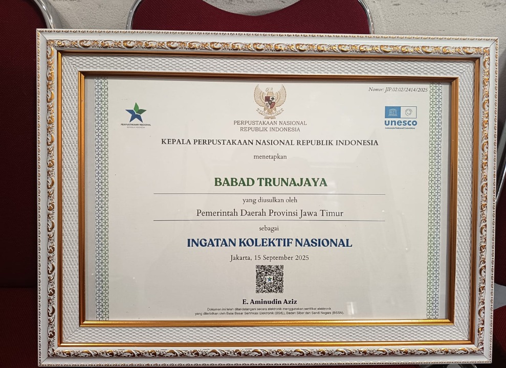SURABAYA - Pemerintah Provinsi Jawa Timur resmi menerima sertifikat pengakuan Naskah Babad Trunajaya sebagai Ingatan Kolektif Nasional (IKON) tahun 2025. Piagam penghargaan tersebut diserahkan langsung oleh Kepala Perpustakaan Nasional RI, Prof. E. Aminudin Aziz, kepada perwakilan Pemprov Jatim di Auditorium Perpusnas RI, Jakarta, Rabu (15/10/2025)