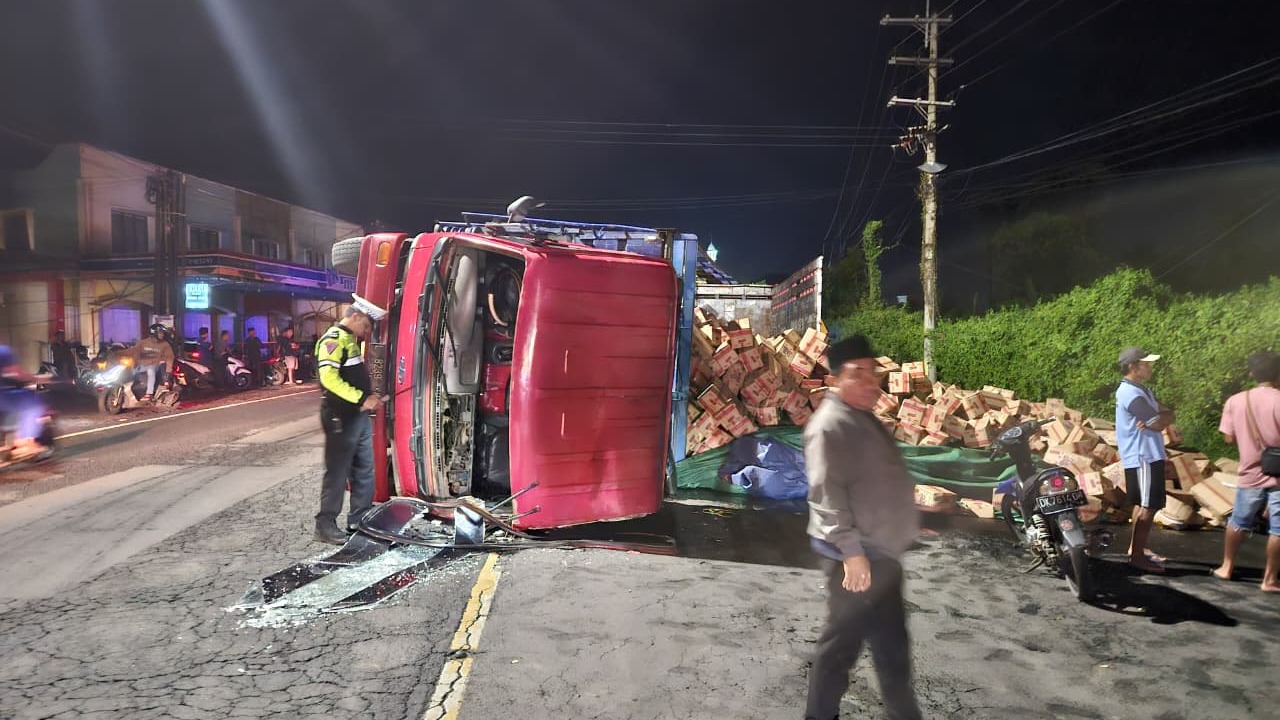 Sebuah truk bermuatan minyak goreng terguling di Jalan Raya Banyuwangi–Situbondo, tepatnya di Desa Ketapang, Kecamatan Kalipuro, Banyuwangi, Kamis (8 Januari 2026) malam. Kecelakaan tersebut tidak menimbulkan korban jiwa.