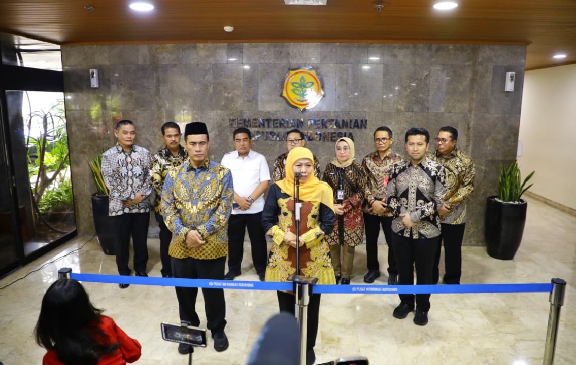 JAKARTA - Gubernur Jawa Timur Khofifah Indar Parawansa bersama Wakil Gubernur Emil Elestianto Dardak saat melakukan pertemuan dengan Menteri Pertanian RI Andi Amran Sulaiman di Kantor Kementerian Pertanian RI Jakarta, Jumat (28/11/2025).