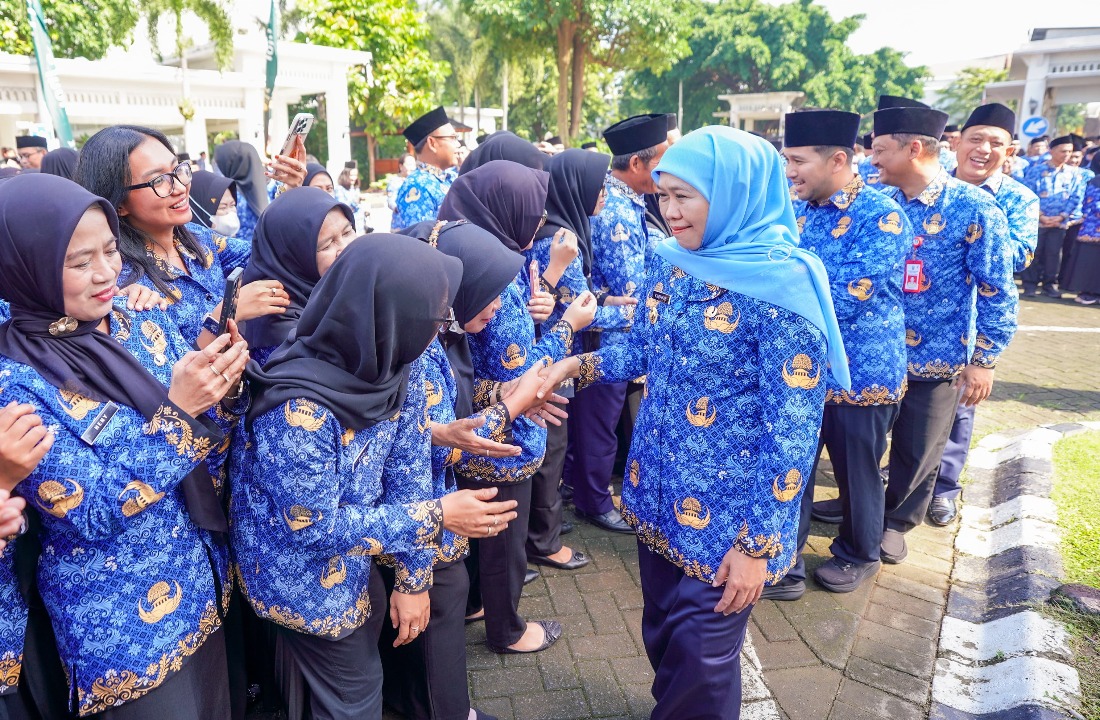 SURABAYA - Gubernur Jawa Timur Khofifah Indar Parawansa memimpin Apel Aparatur Sipil Negara (ASN) di lingkungan Pemerintah Provinsi Jawa Timur yang digelar di halaman Kantor Sekretariat Daerah Provinsi Jawa Timur, Selasa (17/3/2026).