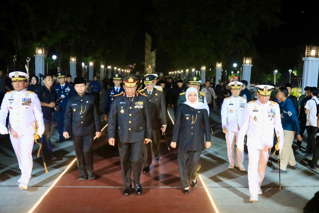 Tepat pukul 00.00 WIB, suasana hening menyelimuti area makam pahlawan ketika Gubernur Khofifah bersama jajaran Forkopimda Jawa Timur menundukkan kepala, mengenang jasa dan pengorbanan para pahlawan bangsa yang telah gugur demi kemerdekaan Indonesia.