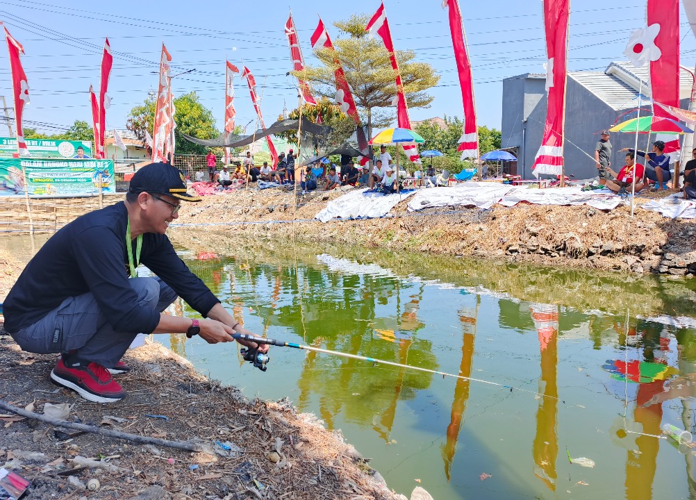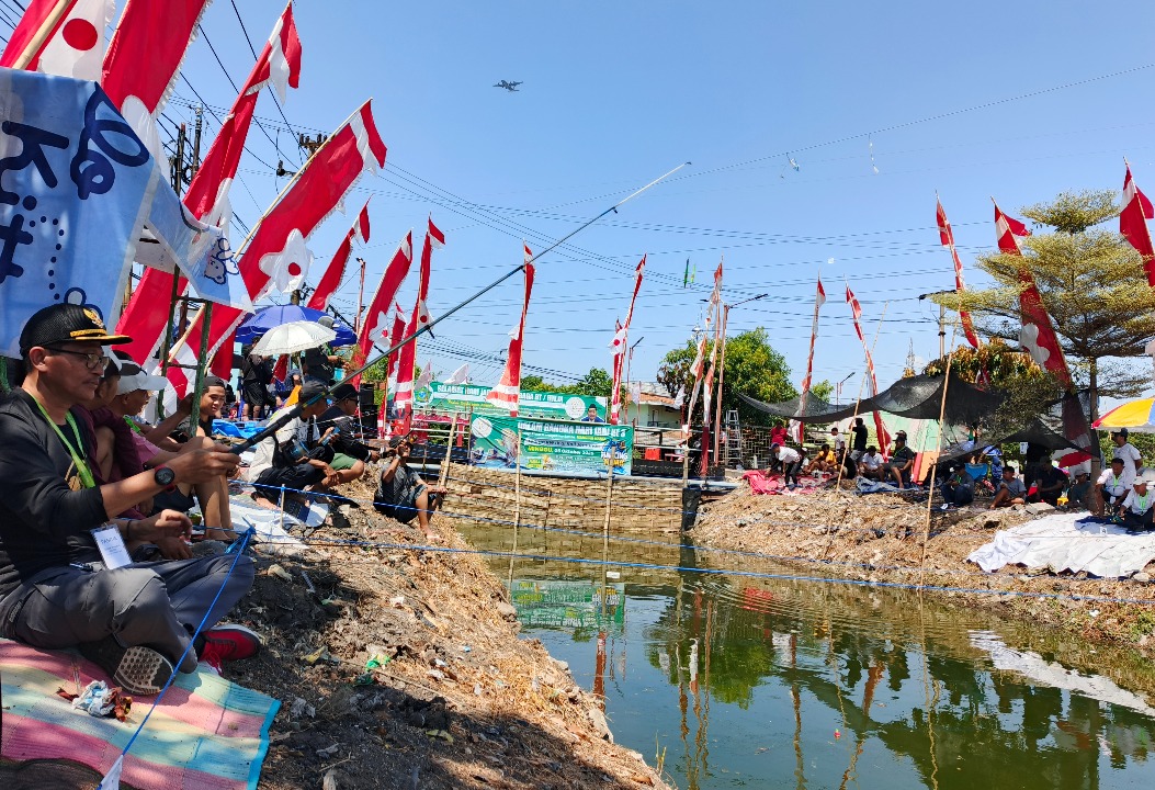 SIDOARJO - Puluhan warga Perum Taman Pondok Pegi, Desa Pepelegi, Kecamatan Waru, Sidoarjo, mengikuti lomba mancing di Sungai Jemundo, Minggu (5/10/2025) pagi.