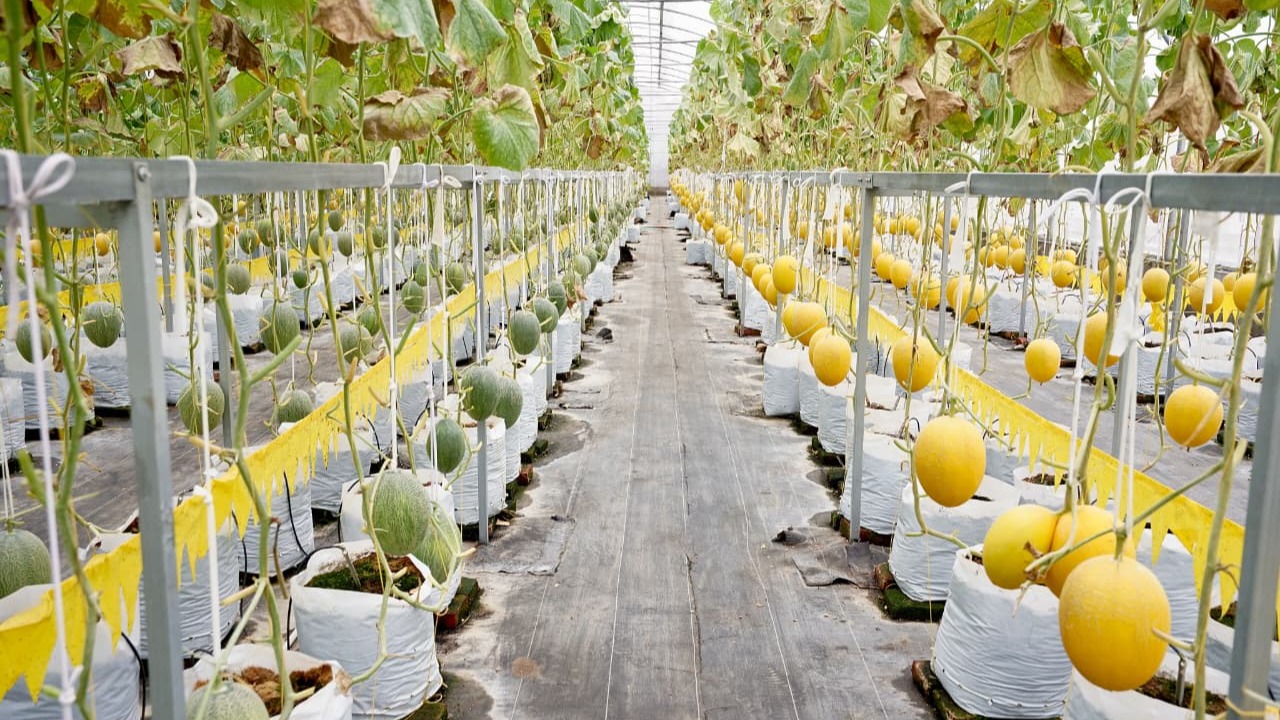 Di greenhouse tersebut dibudidayakan tiga varietas utama, yakni Kirin atau Golden Kirin berwarna kuning bernet, Sweet Hami (Hami Gua) berkulit hijau, serta Golden Aroma dengan kulit hijau dan daging oranye.