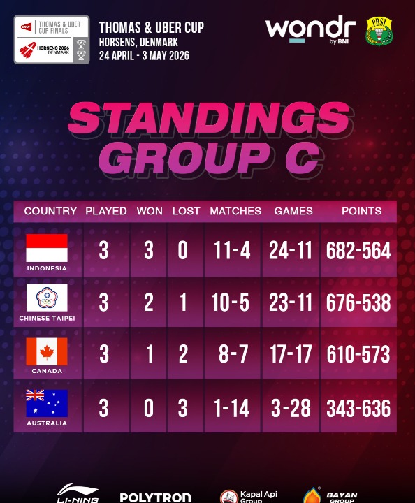 Fase grup Uber Cup 2026 rampung digelar pada Selasa (28/4/2026). Sebanyak delapan tim telah menyegel tempat di perempat final yang akan berlangsung pada Kamis (30/4/2026) mendatang.