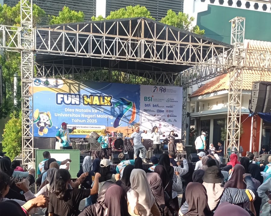 KOTA MALANG - Universitas Negeri Malang (UM) merayakan puncak Dies Natalis ke-71 dengan menyelenggarakan Fun Walk yang meriah, Minggu (12/10/2025). Ribuan civitas akademika, terdiri dari dosen, tenaga kependidikan, dan mahasiswa, memadati Central Park Graha Cakrawala untuk mengikuti kegiatan bertema "Sehat, Bergerak, dan Berdampak" ini.
