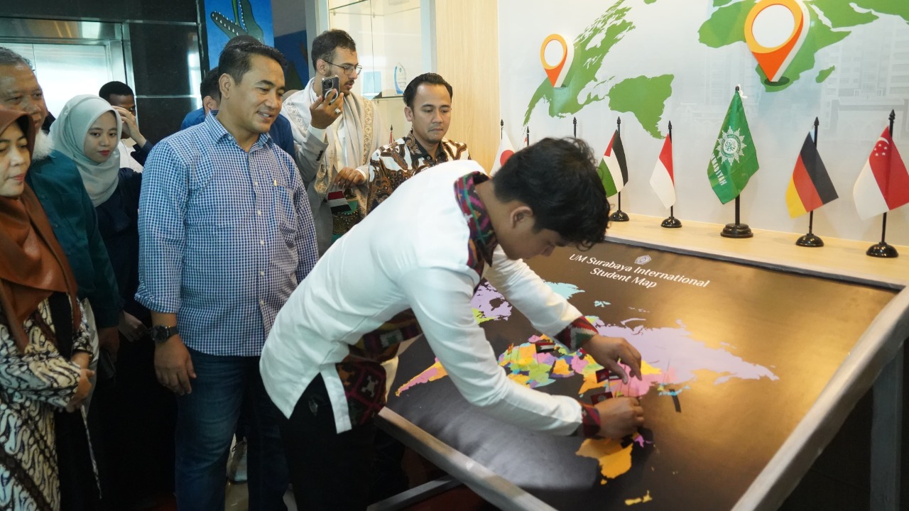 Dalam peresmian, mahasiswa asing dari berbagai negara menancapkan bendera kebangsaan di peta dunia. Aksi itu menjadi simbol persaudaraan global sekaligus komitmen UMSurabaya terhadap pendidikan tanpa batas.