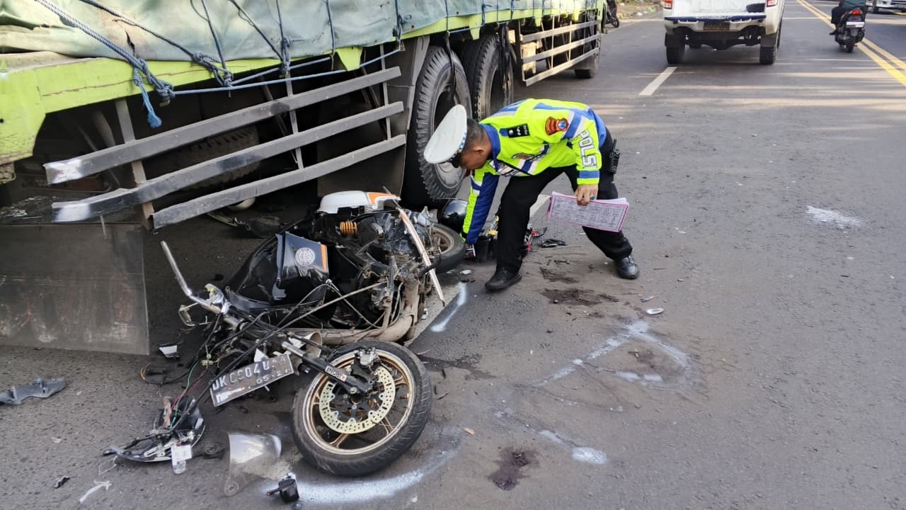 "Karena jarak yang sudah sangat dekat, pengendara sepeda motor tidak dapat menghindar lalu menabrak bak belakang kanan truk," ujarnya.