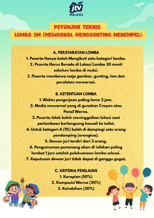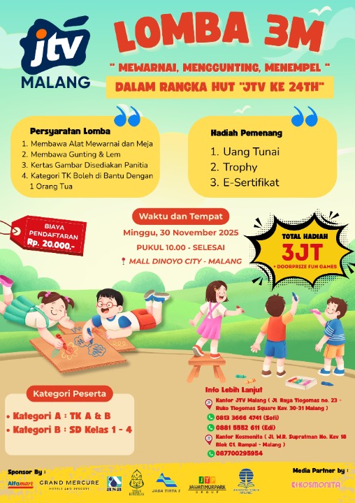 KOTA MALANG - Dalam Rangka HUT JTV Malang yang ke 24tahun, kami mengajak Anak-Anak untuk menyalurkan bakat dalam bentuk kreativitas tanpa batas di lomba kali ini! Akan ada hadiah total senilai 3jt dan doorprize menarik yang bisa di dapat, Trophy dan E-Sertifikat untuk semua peserta🎁🏆🥳