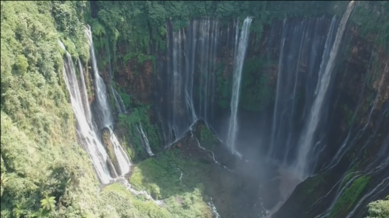 Inilah keindahan alam wisata air terjun tumpak sewu, di kaki ginung semeru di desa sidomulyo, kecamatan pronojiwo , lumajang .