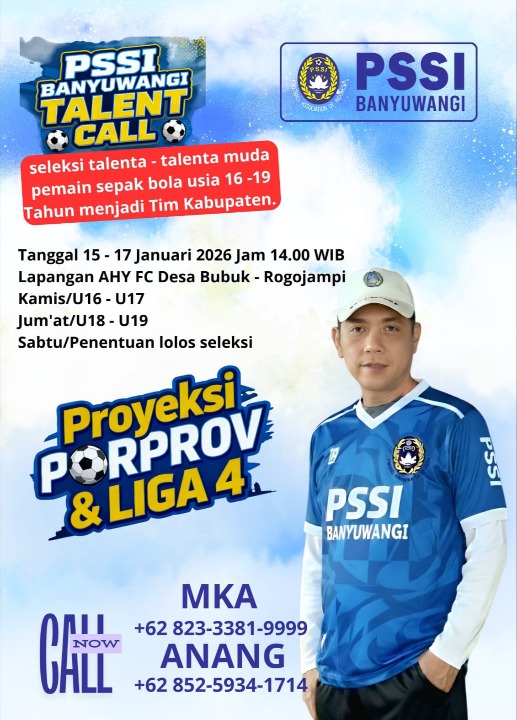 PSSI Banyuwangi akan membuka seleksi terbuka, yang di jadwalkan bakal di geber pada tanggal 15 hingga 17 Januari 2026,di stadion AHY FC, Desa Bubuk, Kecamatan Rogojampi, seleksi Usia 16-19 Tahun tersebut Dipersiapkan secara intensif untuk menghadapi ajang Pekan Olahraga Kabupaten (Porkab), Pekan Olahraga Provinsi (Porprov), dan Liga 4.