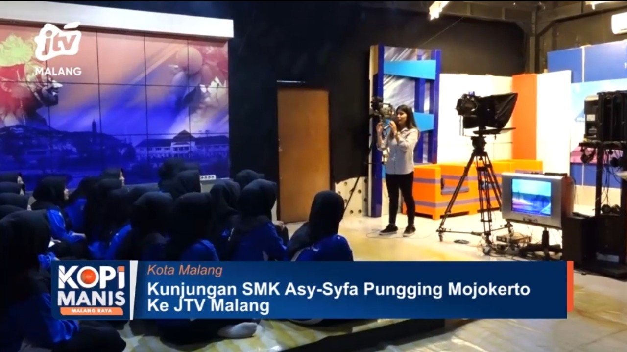 KOTA MALANG - JTV Malang kembali menjadi tujuan kunjungan industri bagi lembaga pendidikan. Kali ini, puluhan siswa beserta guru dari SMK Asy-Syifa Pungging, Kabupaten Mojokerto, Jawa Timur, berkesempatan mengenal lebih dekat aktivitas dan teknologi di industri pertelevisian.