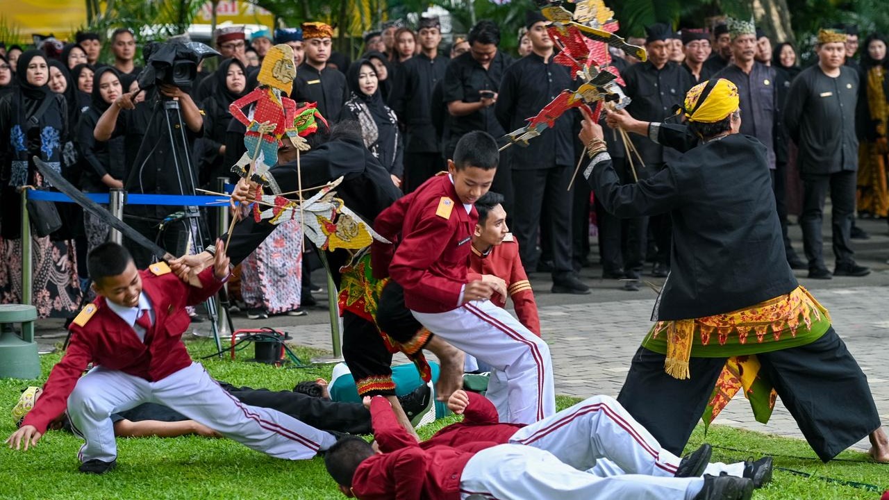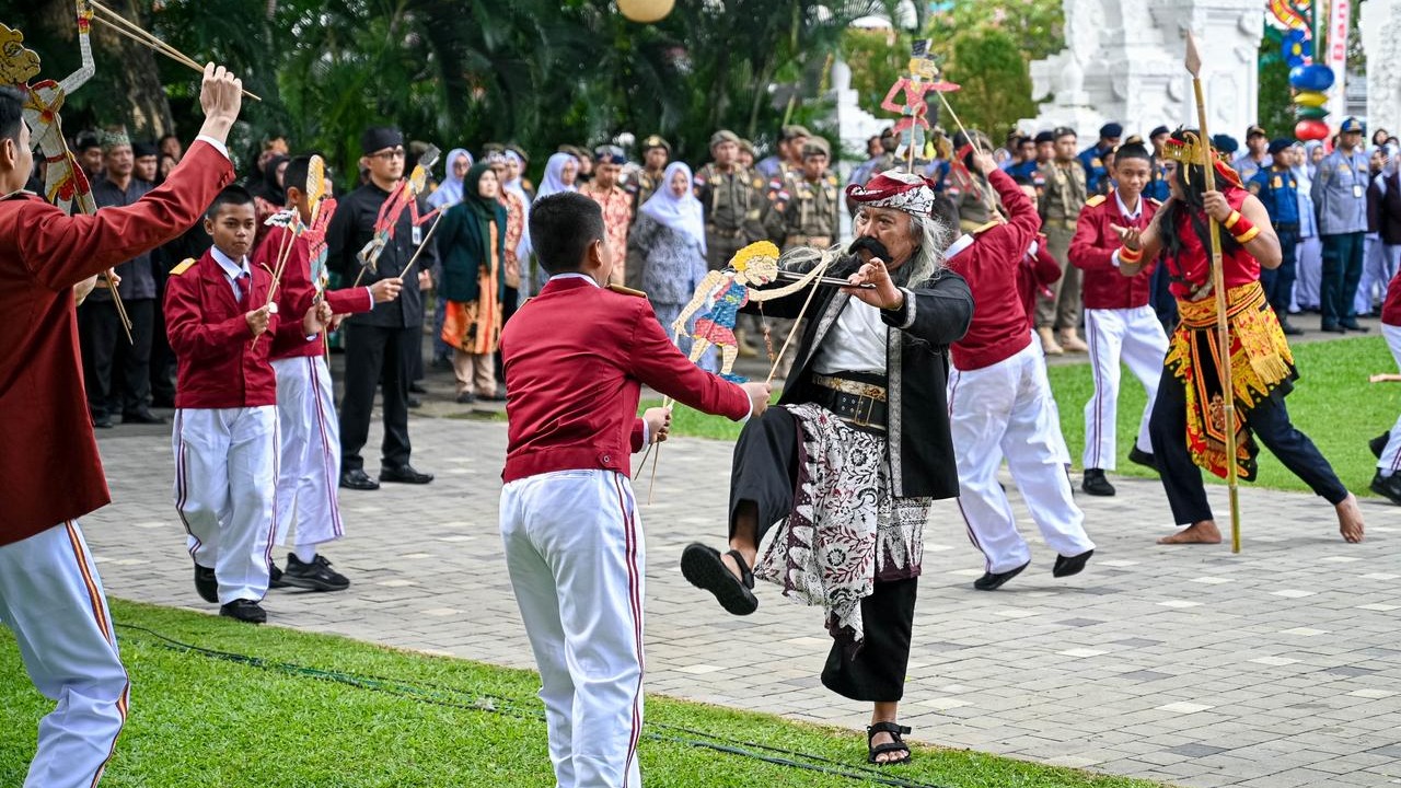 Puluhan siswa Sekolah Rakyat Banyuwangi menampilkan fragmen dalam Upacara Peringatan Hari Jadi Banyuwangi (Harjaba) ke-254 yang digelar halaman Kantor Bupati Banyuwangi, Kamis (18 Desember 2025). Para penonton sangat terhibur dengan penampilan mereka dalam fragmen Perang Puputan Bayu.