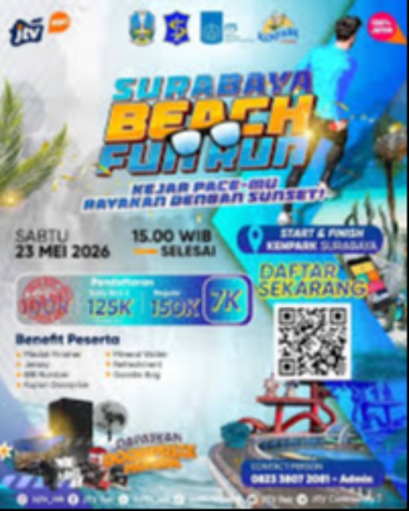 Informasi lebih lanjut terkait Maritim Fest dan Surabaya Beach Fun Run dapat diakses melalui kanal resmi JTV. Kegiatan ini diharapkan menjadi ruang bagi masyarakat untuk berolahraga sekaligus menikmati keindahan pesisir dalam suasana festival maritim yang meriah.(Luluk Listiani)