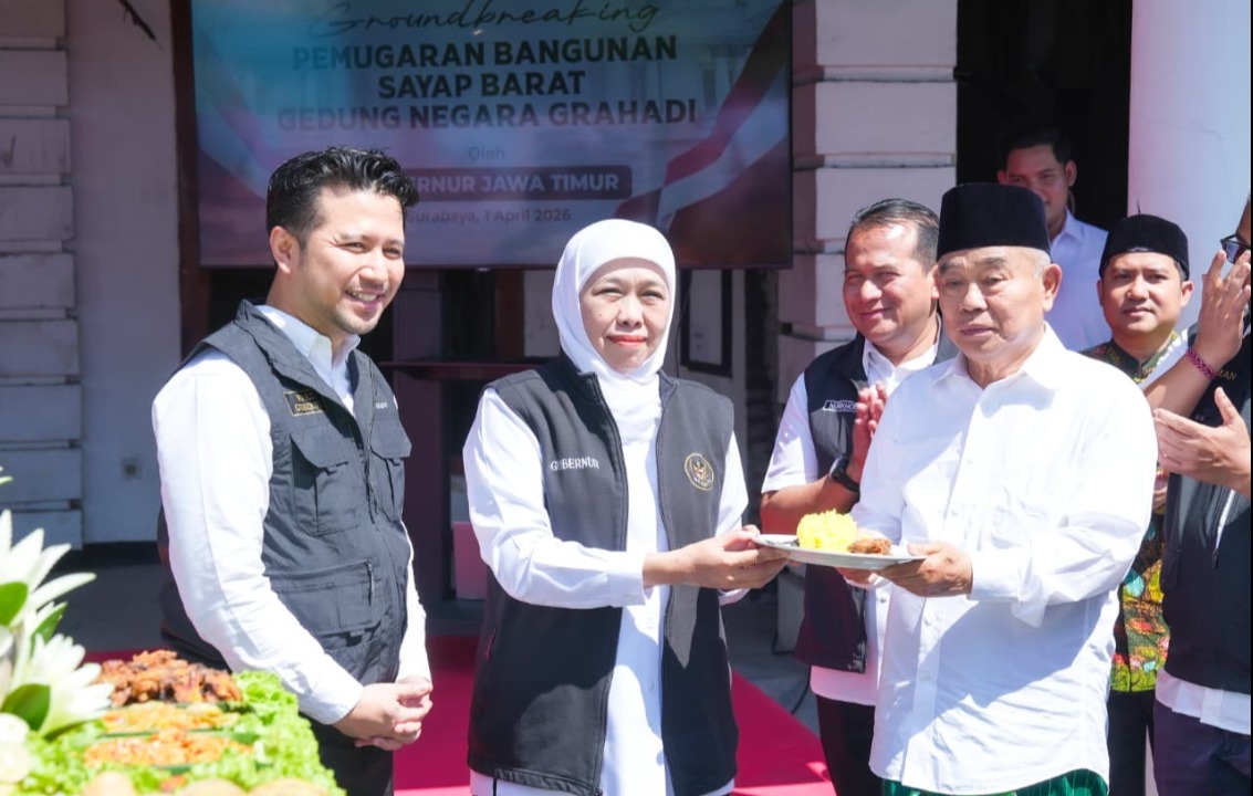 Gubernur Jawa Timur Khofifah Indar Parawansa bersama Wakil Gubernur Jawa Timur Emil Elestianto Dardak memimpin langsung prosesi groundbreaking pemulihan bangunan sayap barat Gedung Negara Grahadi pada Rabu (1/4/2026) pagi.