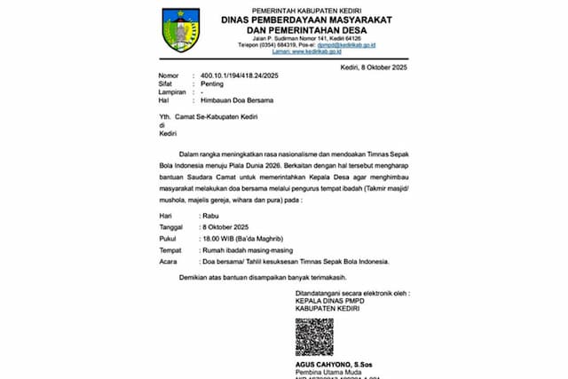 “Dalam rangka meningkatkan rasa nasionalisme dan mendoakan Timnas Sepak Bola Indonesia menuju Piala Dunia 2026, kami mengimbau seluruh warga untuk mengadakan doa bersama,” tulis Kepala Dinas PMPD Kabupaten Kediri Agus Cahyono, S.Sos dalam surat edaran bersifat penting, dengan nomor 400.10.1/194/418.24/2025.