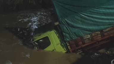 Truk Fuso Gandeng Terbalik dan Masuk Sungai