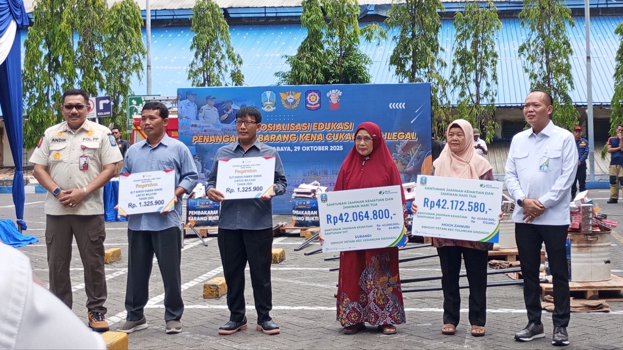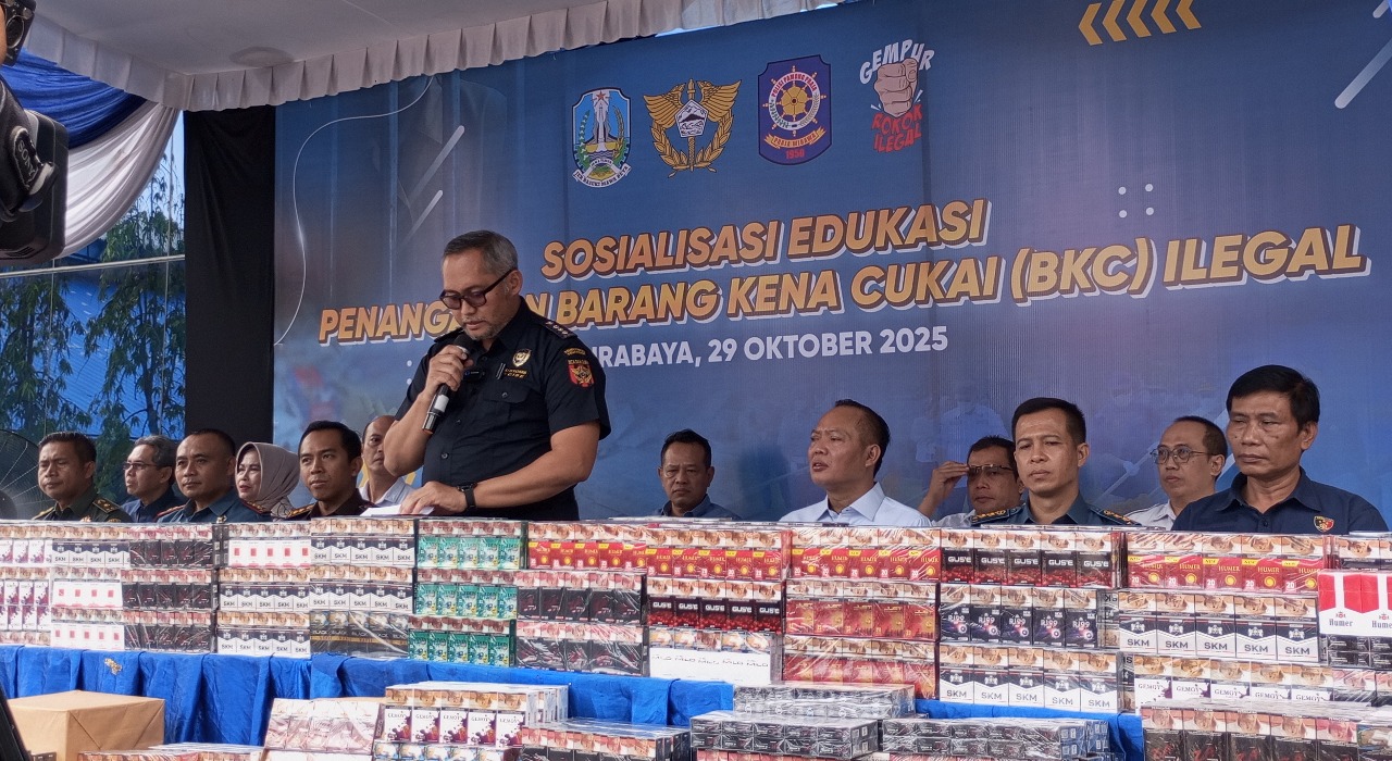 SURABAYA - Pemerintah Provinsi Jawa Timur bersama Direktorat Jenderal Bea dan Cukai Jawa Timur terus memperkuat sinergi dalam memberantas peredaran rokok ilegal. Salah satunya melalui kegiatan Sosialisasi Edukasi Penanganan Barang Kena Cukai Ilegal yang digelar di halaman Gedung JTV Surabaya, Kompleks Graha Pena, Rabu (29/10/2025) pagi.