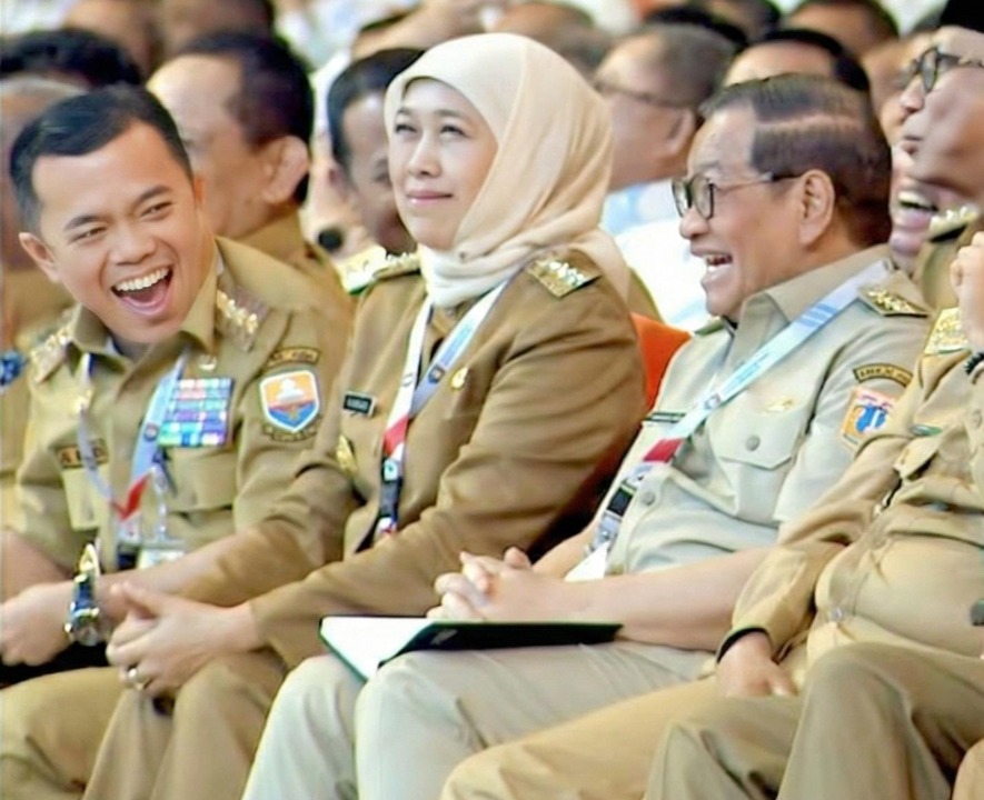 SENTUL - Gubernur Jawa Timur Khofifah Indar Parawansa, Wakil Gubernur Jatim Emil Elestianto Dardak, dan Forkopimda Jatim menghadiri Rapat Koordinasi Nasional (Rakornas) Pemerintah Pusat dan Daerah yang dipimpin langsung oleh Presiden Republik Indonesia Prabowo Subianto di Sentul Internasional Convention Center di Bogor, Jawa Barat, Senin (2/2/2026).