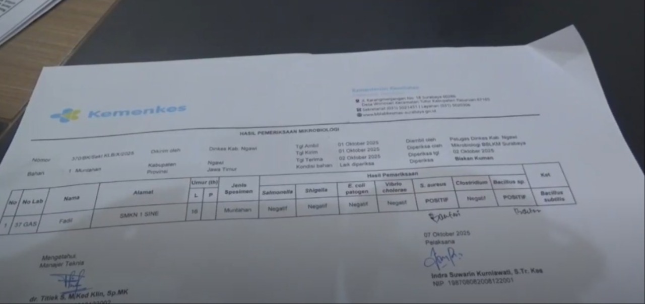Kepala Bidang SDM Kesehatan dan Kefarmasian Dinkes Ngawi, Dhina Handayani, menjelaskan bahwa sampel makanan yang dikirim ke Balai Besar Laboratorium Kesehatan Masyarakat (BBLKM) Surabaya menunjukkan hasil positif mengandung bakteri.