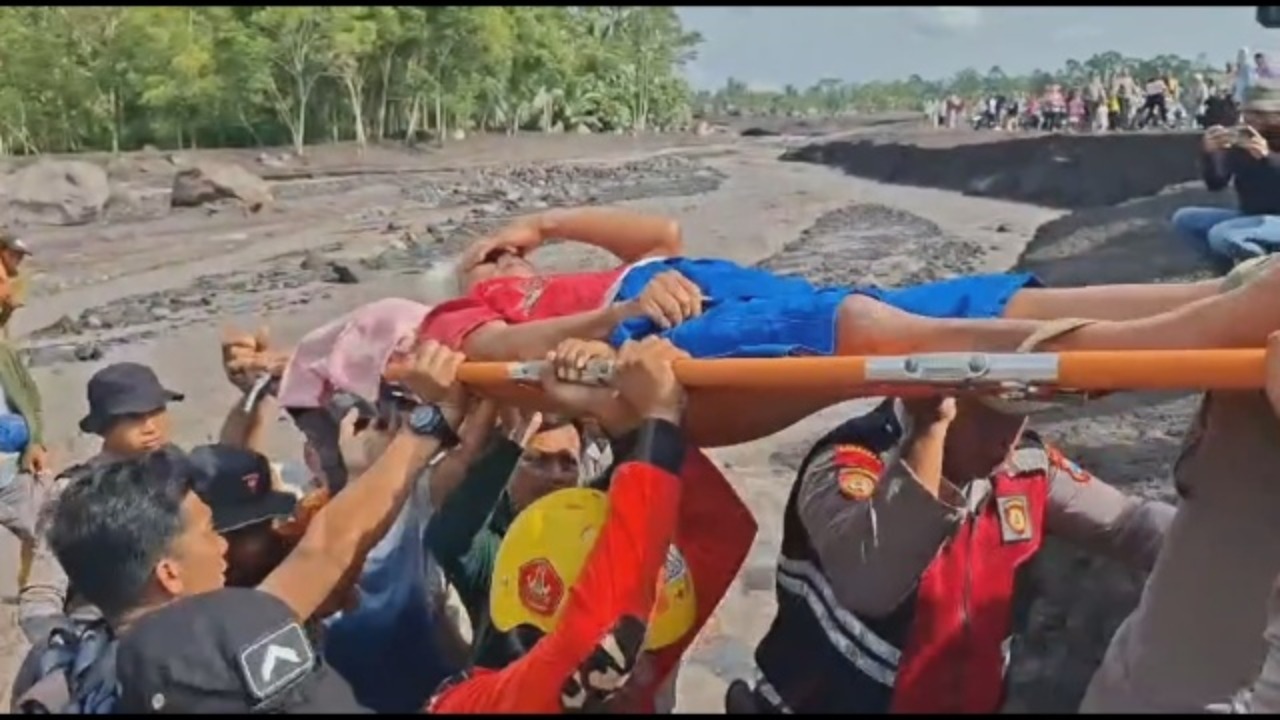 Petugas gabungan melakukan evakuasi terhadap para lansia dan disabilitas dari lokasi terisolasi yang terdampak banjir lahar di lumajang. Petugas menandu para korban melewati derasnya sungai lahar gunung semeru.