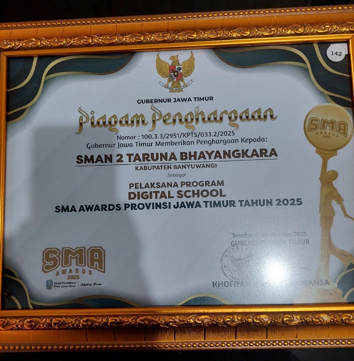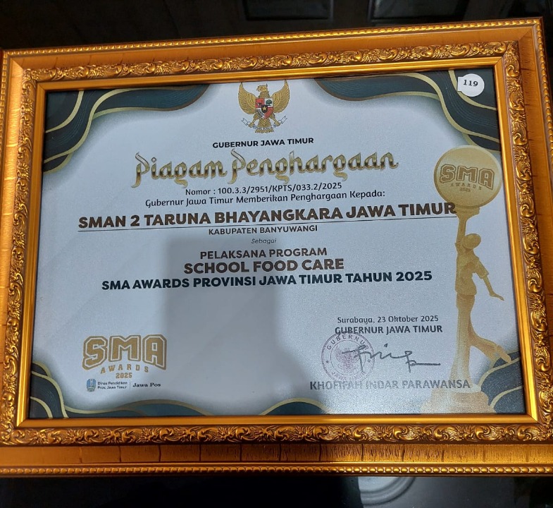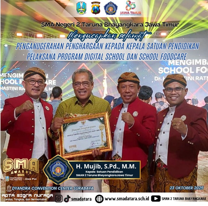 Piagam pengahargaan diterima secara langsung oleh Kepala Sekolah SMAN 2 Taruna Bhayangkara Jawa Timur, H. Mujib, S.Pd., M.M. pada kamis 23 Oktober 2025,di Dyandra Convention Center, Surabaya.